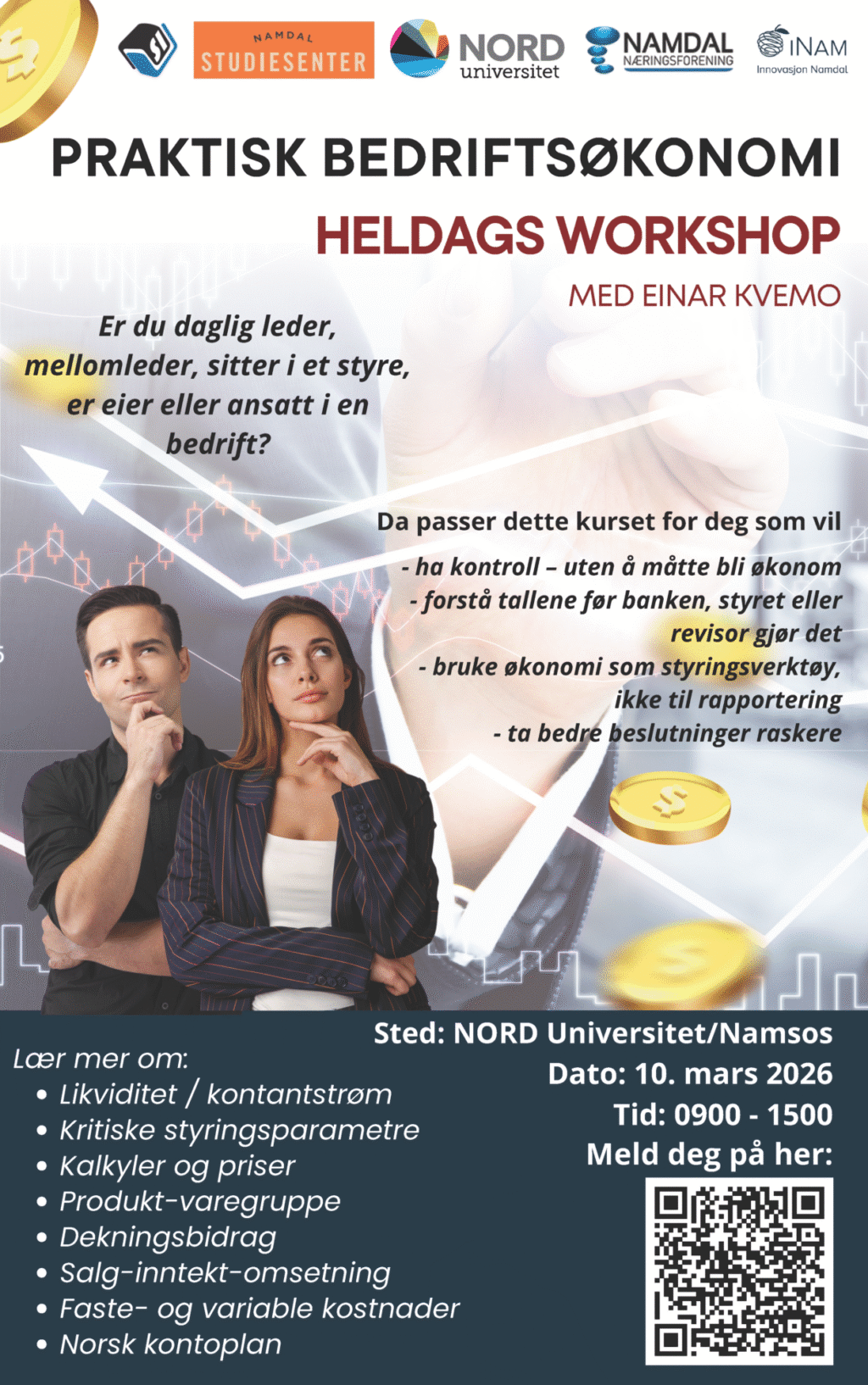 10. mars har vi satt opp heldags workshop i praktisk bedriftsøkonomi for deg som vil forstå økonomien – uten å måtte bli økonom Er du daglig leder, mellomleder, styremedlem, eier eller ansatt i en bedrift? Dette kurset passer for deg som ønsker å: ha kontroll på likviditet og kontantstrøm forstå tallene før banken, styret eller revisor…